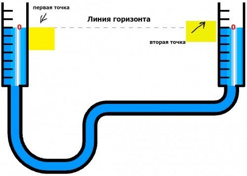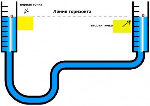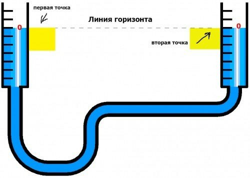Одновременно с помощником открываем колбы гидроуровня и следим за уровнем воды в колбе. Если уровень подымается, то вам следует приподнять колбу гидроуровня так, чтобы уровень воды совпал с нулевой отметкой на колбе. Это будет точка строго горизонтальная относительно выбранной нами первой метки.